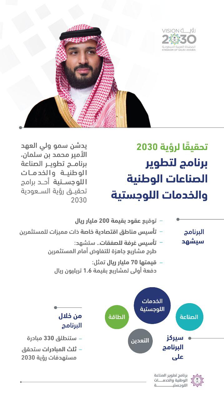 تحقيقاً لرؤية المملكة العربية السعودية 2030 يدشن سمو ولي العهد الأمير محمد بن سلمان، برنامج تطوير الصناعة الوطنية والخدمات اللوجستية، والذي يعد أحد برامج تحقيق رؤية السعودية 2030.