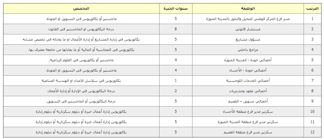 أعلن المركز الوطني للنخيل والتمور عبر موقعه الإلكتروني توفر وظائف إدارية شاغرة للعمل بعدة مدن بالمملكة، للعمل بالمسميات التالية (مدير فرع المركز الوطني للنخيل والتمور بالمدينة المنورة، ومستشار قانوني، ومسؤول مشاريع مراجع داخلي، وأخصائي جودة، وأخصائي جودة، وأخصائي الخدمات اللوجستية، وأخصائي عقود ومشتريات، وأخصائي تسويق، وسكرتير مدير فرع منطقة الأحساء، وسكرتير مدير فرع منطقة المدينة المنورة، وسكرتير مدير فرع منطقة القصيم)، وذلك وفقاً للتفاصيل والشروط الموضحة بالجدول أدناه.