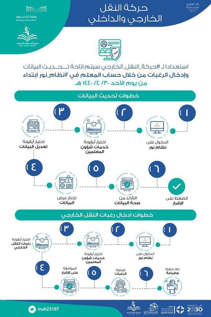 حددت وزارة التعليم 12 خطوة لتحديث بيانات المعلمين والمعلمات، عبر نظام نور وإدخال الرغبات للنقل الخارجي.