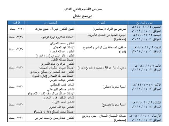 أعلنت اللجنة المنظمة لمعرض القصيم الثاني للكتاب، عن تفاصيل البرنامج الثقافي للمعرض، والذي يضم مجموعة من المحاضرات والأمسيات واللقاءات والندوات الثقافية والعلمية والشعرية والتاريخية.
