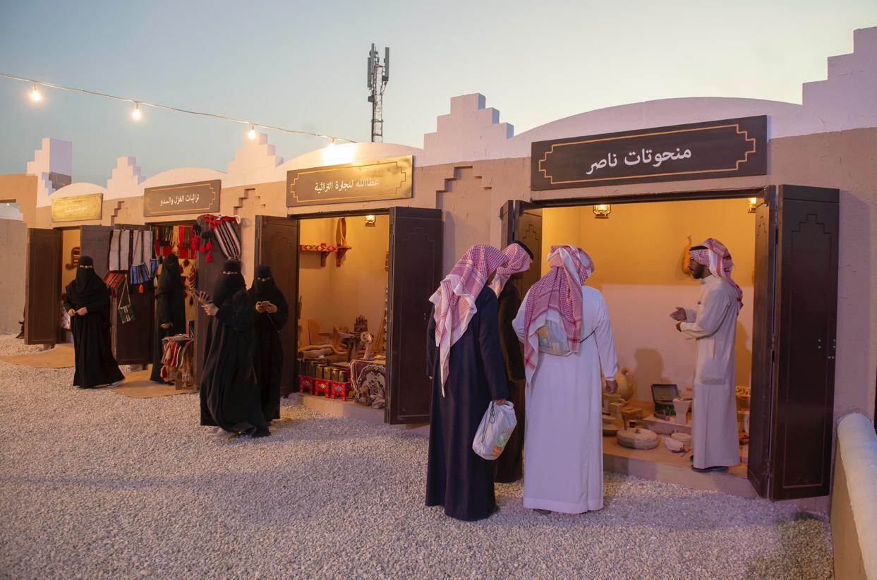 ويُبرز السوق الشعبي فن السدو بأشكاله وألوانه المختلفة، والأعمال التراثية القديمة التي ما زال يحرص عليها محبو التراث، والمنحوتات والفخاريات ذات القيمة التراثية والفنية، وطحن الحبوب على الرحى، بالإضافة إلى المشغولات اليدوية والمجوهرات التقليدية وكل ما يتعلق بزينة الرجل والمرأة قديمًا.