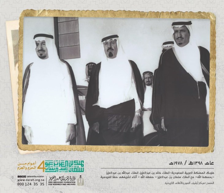 وعلقت إدارة الحساب في تغريدة لها على الصورة بقولها: ”ملوك المملكة العربية السعودية الملك خالد بن عبدالعزيز والملك عبدالله بن عبدالعزيز – رحمهما الله – مع خادم الحرمين الشريفين الملك سلمان بن عبدالعزيز حفظه الله – أثناء تشريفهم حفلاً للفروسية عام ١٣٩٨هـ / ١٩٧٨م”.