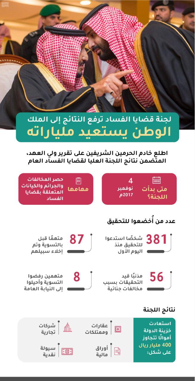 وكان الديوان الملكي قد أصدر بيانًا مساء الأربعاء والذي تضمن اطلاع خادم الحرمين الشريفين الملك سلمان بن عبدالعزيز، على التقرير المقدم من سمو ولي العهد الأمير محمد بن سلمان، المتضمن أن اللجنة العليا لقضايا الفساد العام أنهت أعمالها في قضايا استدعاء 381 شخصًا.