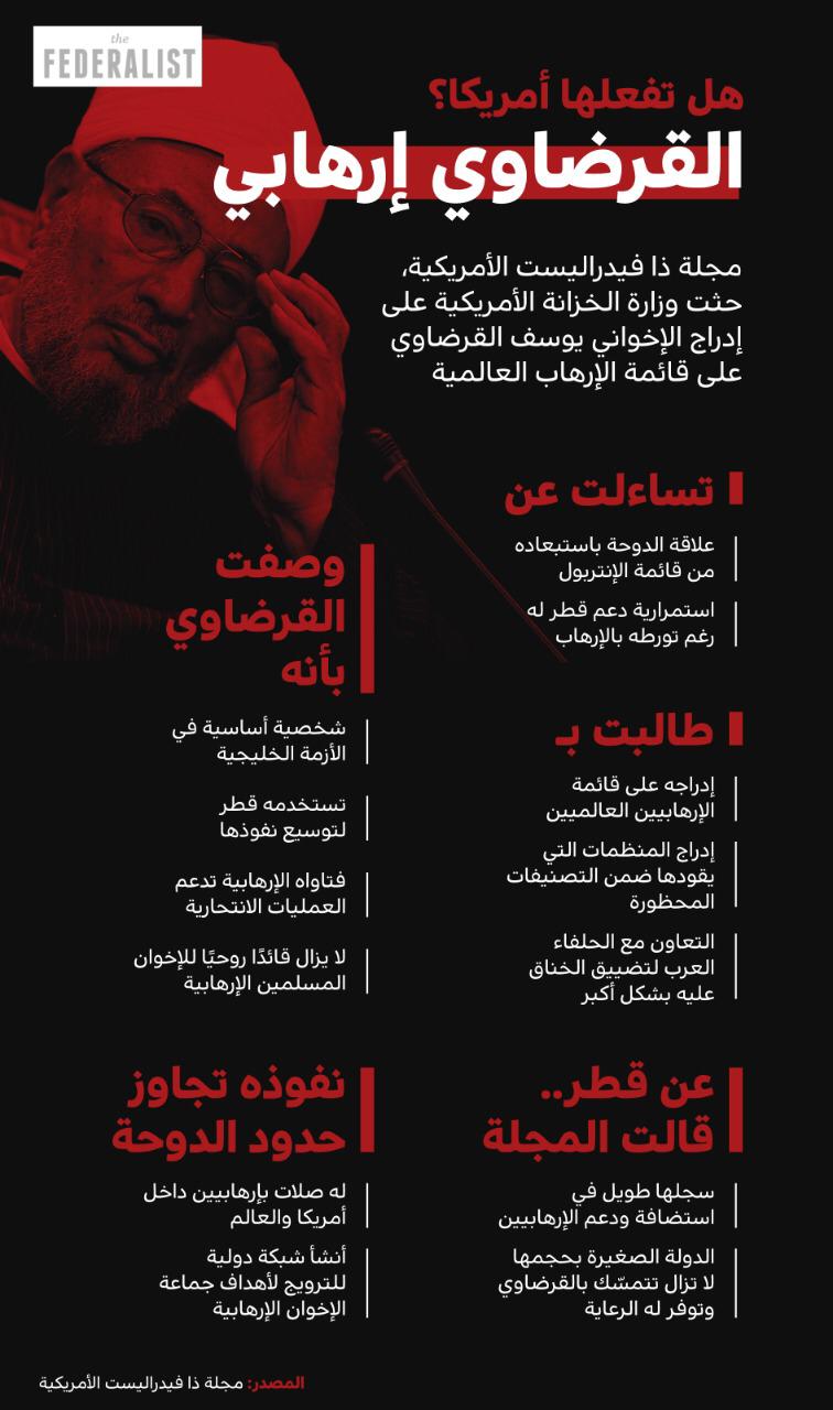 حثت مجلة فيدراليست الأمريكية، وزارة الخزانة الأمريكية على إدراج الإخواني يوسف القرضاوي على قائمة الإرهاب العالمية.