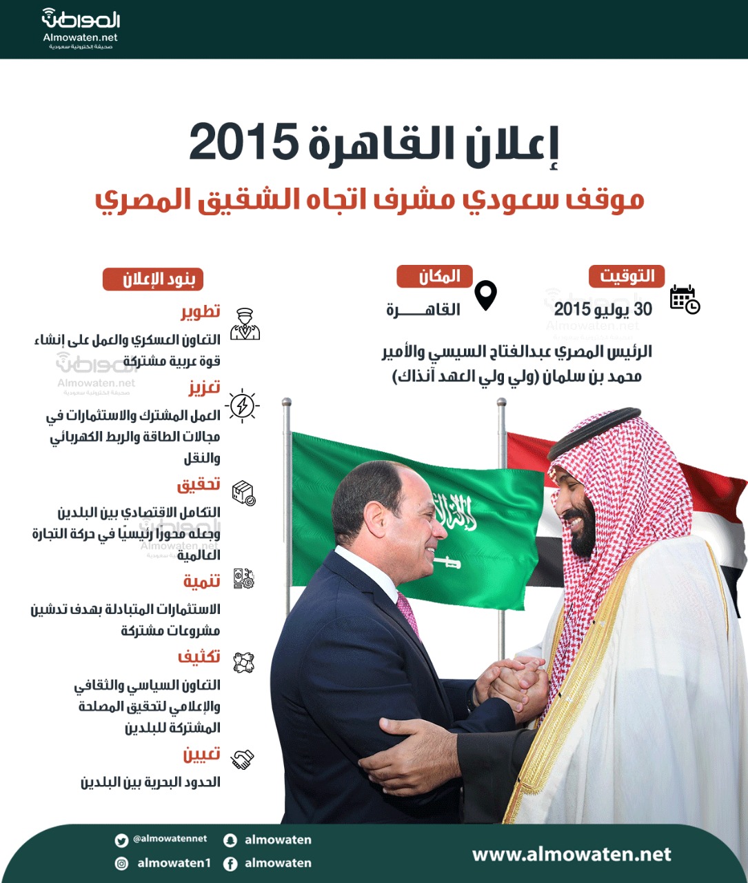 ومن أهم هذه المحطات في مسيرة العلاقات بين الرياض والقاهرة، “إعلان القاهرة 2015”.. والذي سجل موقفاً سعودياً مشرفاً تجاه الشقيق المصري.