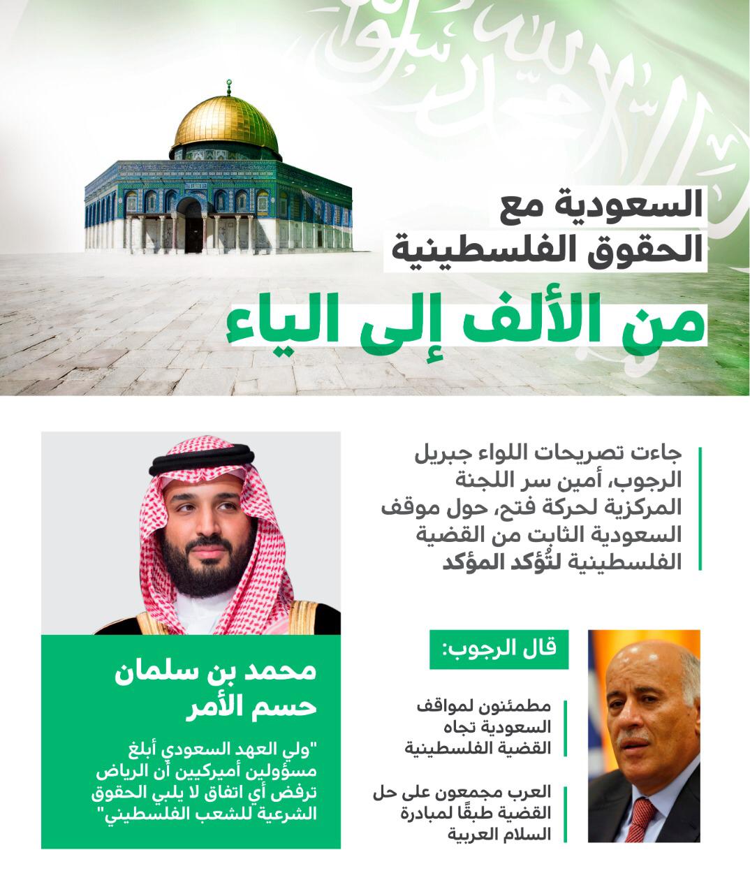 وتابع الرجوب أن ولي العهد الأمير محمد بن سلمان، أبلغ مسؤولين أميركيين أن الرياض ترفض أي اتفاق لا يلبي الحقوق الشرعية للشعب الفلسطيني.