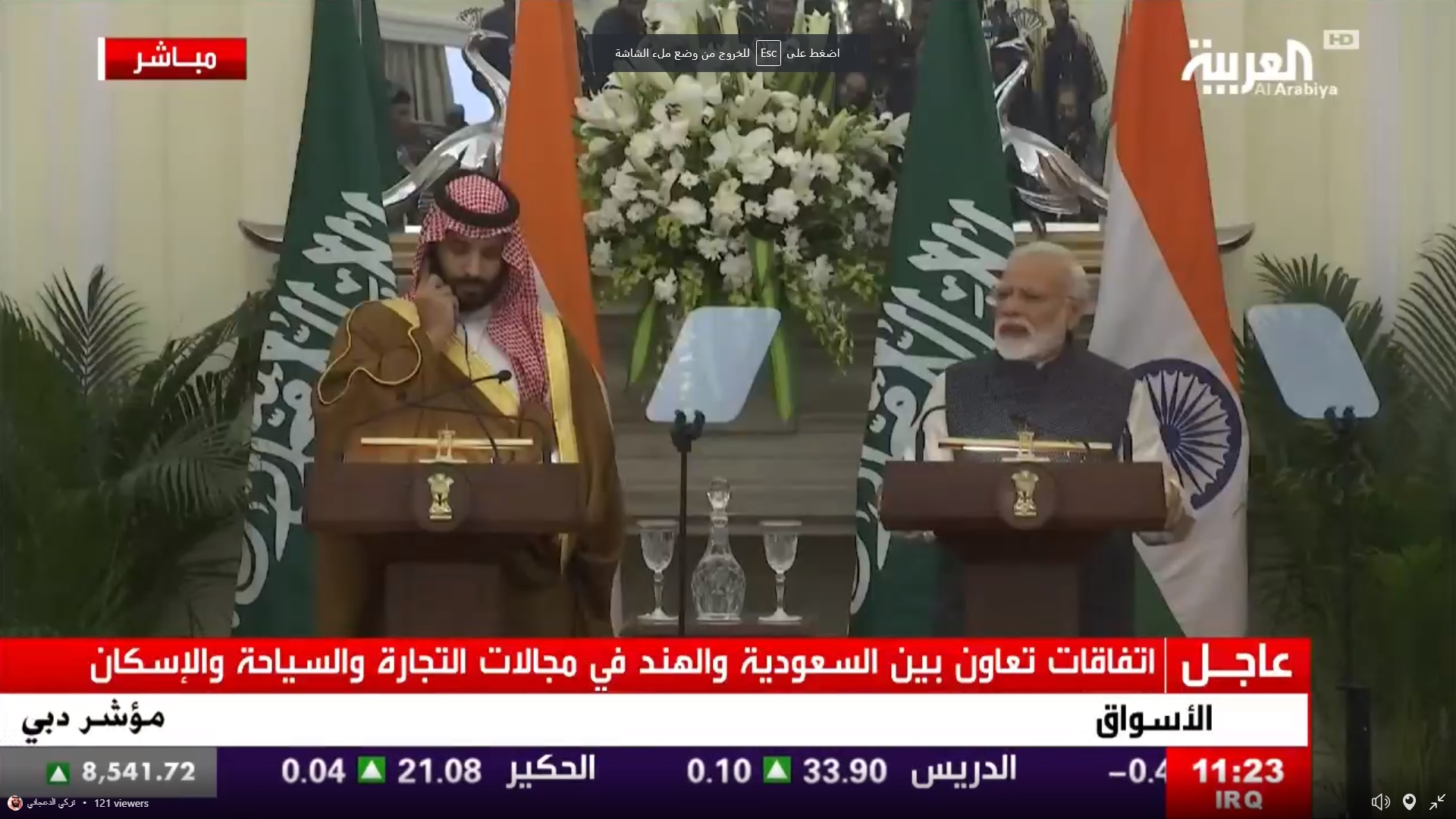وخلال المؤتمر الصحفي المشترك بين ولي العهد ورئيس وزراء الهند، أشاد مودي بالعلاقات بين بلاده والسعودية بعد التوقيع على اتفاقات التعاون، موضحًا أن اتفاقات التعاون بين السعودية والهند في مجالات التجارة والسياحة والإسكان.