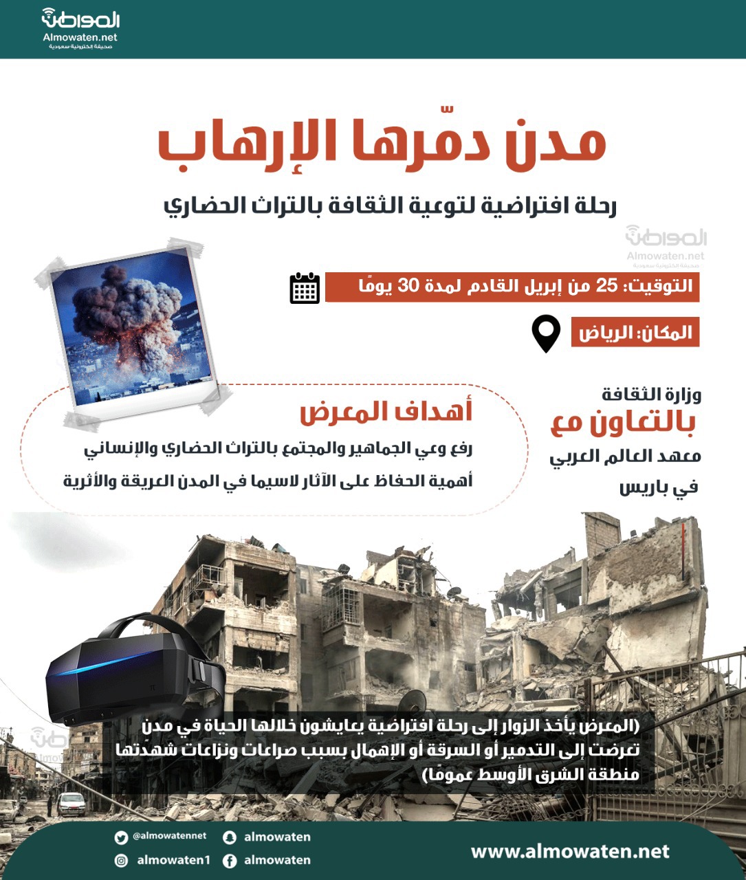 تنظم وزارة الثقافة، بالتعاون مع معهد العالم العربي في باريس، معرضًا توعويًّا بعنوان “مدن دمرها الإرهاب.. رحلة افتراضية لتوعية الثقافة بالتراث الحضاري”.