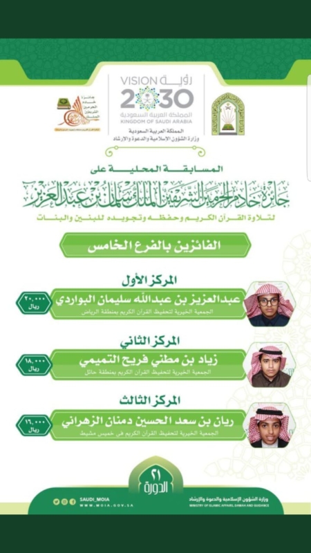حققت جمعية نبأ الخيرية لتحفيظ القرآن الكريم بمحافظة خميس مشيط، حضوراً بارزاً ومميزاً في مسابقة خادم الحرمين الشريفين الملك سلمان بن عبدالعزيز على مستوى المملكة في دورتها 21، والتي تم اختتام فعالياتها أمس الثلاثاء.