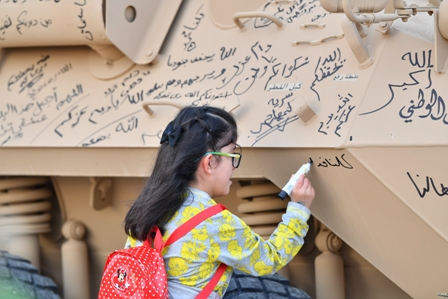 وتوسطت المدرعة ساحة المهرجان شمال الرياض ، وحلّق حولها الزوار وانطلقوا في رسائلهم العفوية ودعواتهم الصادقة بالنصر لجنود الوطن المرابطين على “خده” الجنوبي.