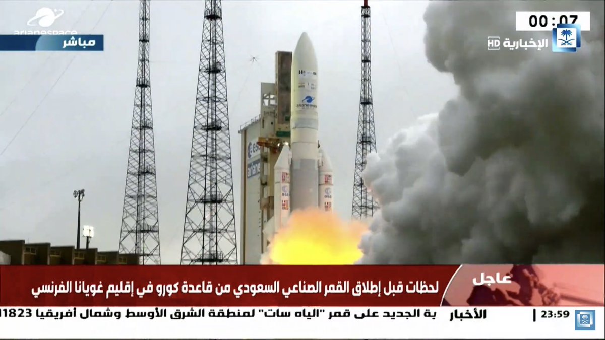 أُطلق أول قمر صناعي سعودي للاتصالات من قاعدة كورو في إقليم غويانا الفرنسي، مع دقات الساعة الـ12 منتصف الليل.