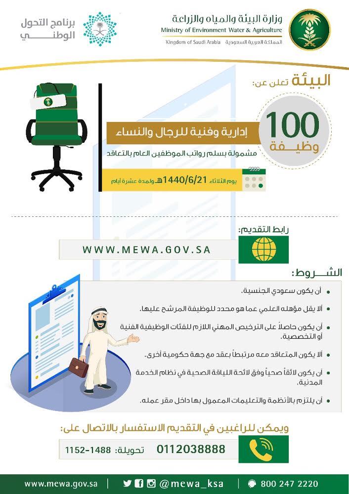 أعلنت وزارة البيئة والمياه والزراعة عن 100 وظيفة إدارية وفنية للرجال والنساء، مشمولة بسلم رواتب الموظّفين العام بالتعاقد.