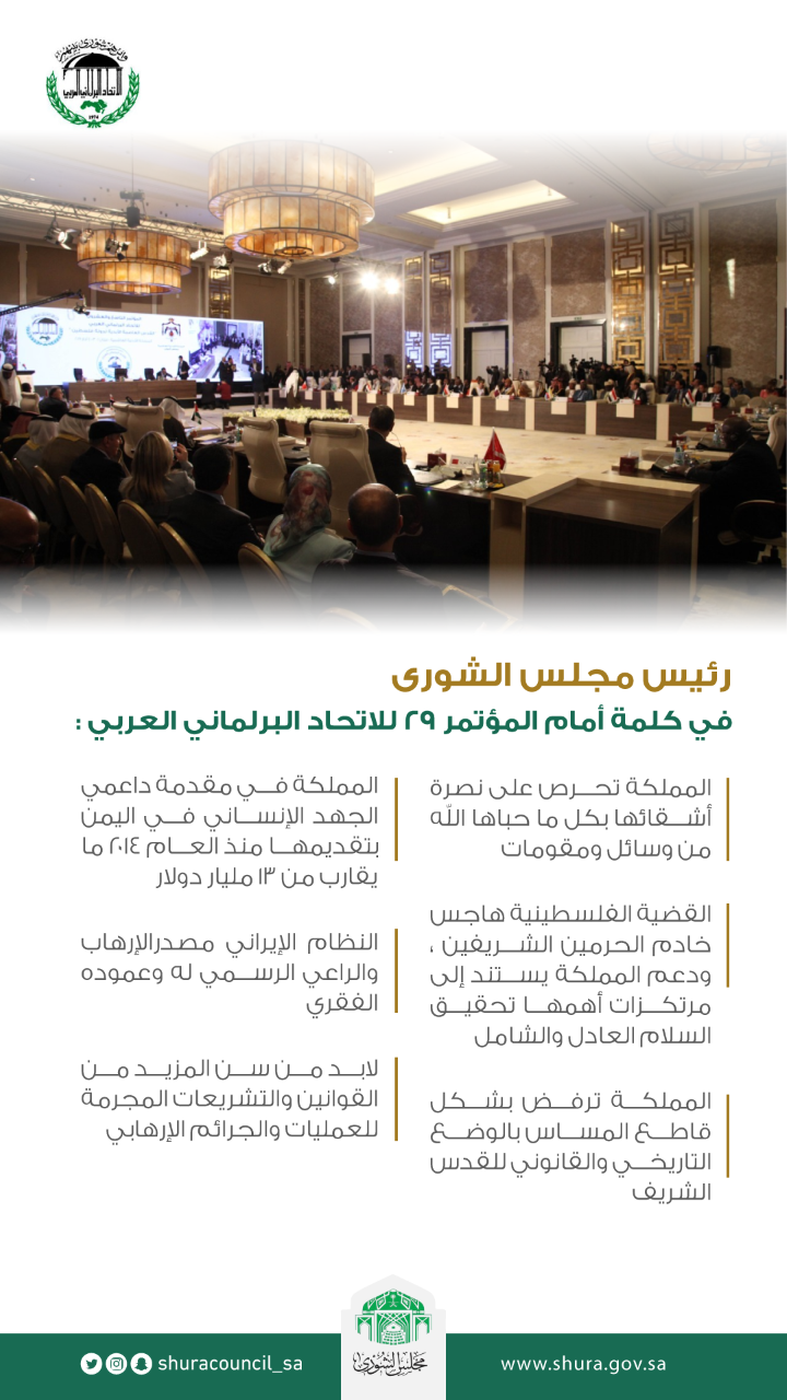 وقال معاليه في كلمة ألقاها أمس في أعمال المؤتمر التاسع والعشرين للاتحاد البرلماني العربي الذي يعقد حاليا بالعاصمة الأردنية عمان أن المملكة تؤكد أن مواقفها تجاه القضايا الإقليمية والدولية ثابتة وواضحة، حيث تعد القضية الفلسطينية في مقدمة اهتماماتها، وذلك استشعاراً لمكانة القدس الشريف المبارك، مسرى نبينا محمد صلى الله عليه وسلم، وإيماناً بقول الله عز وجل في كتابه الكريم: ” سُبْحَانَ الَّذِي أَسْرَى بِعَبْدِهِ لَيْلًا مِّنَ الْمَسْجِدِ الْحَرَامِ إِلَى الْمَسْجِدِ الْأَقْصَى الَّذِي بَارَكْنَا حَوْلَهُ لِنُرِيَهُ مِنْ آيَاتِنَا إِنَّهُ هُوَ السَّمِيعُ الْبَصِيرُ “.