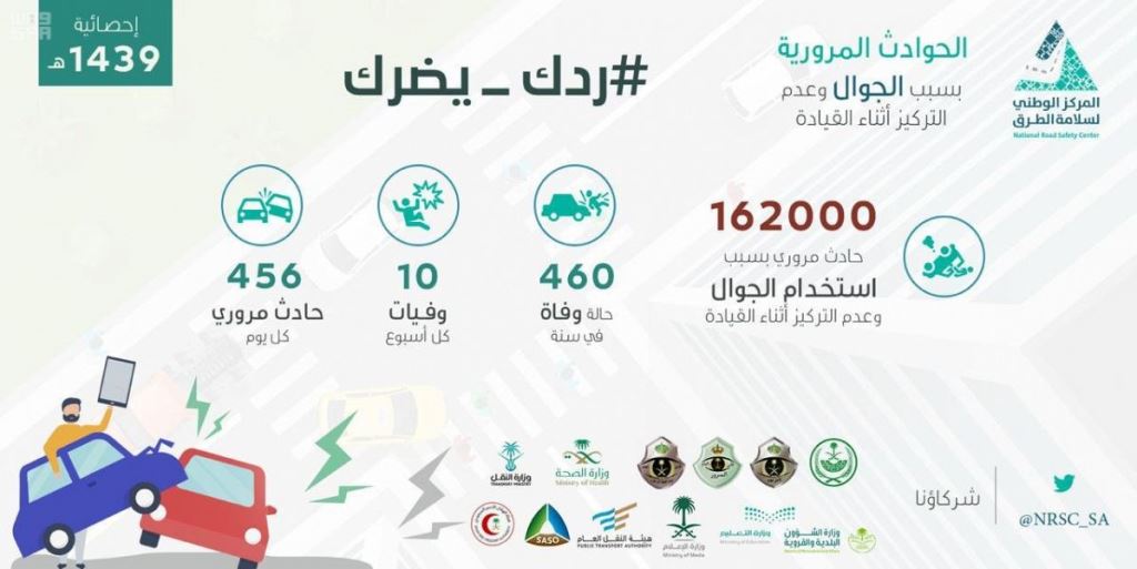 يذكر أن عدد الوفيات بلغ في عام 1439هـ، 460 حالة وفاة جرّاء استخدام الجوال، وعدم التركيز أثناء القيادة، بمعدل 10 وفيات أسبوعيًّا، فيما بلغت الحوادث المرورية في العام نفسه 161702، بمعدل 456 حادثًا يوميًّا.