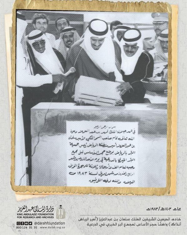 نشرت دارة الملك عبدالعزيز صورة نادرة، لخادم الحرمين الشريفين الملك سلمان بن عبد العزيز -حفظه الله- أثناء وضعه لحجر الأساس لمجمع خيري في الدرعية.