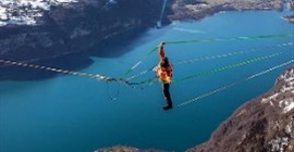 ووقعت المغامرة أعلى مياه بحيرة فالينسي في جبال الألب على ارتفاع 940 مترًا، والتقط العرض المذهل والمثير للرعب من قبل المصور توبياس رودينكيرش.