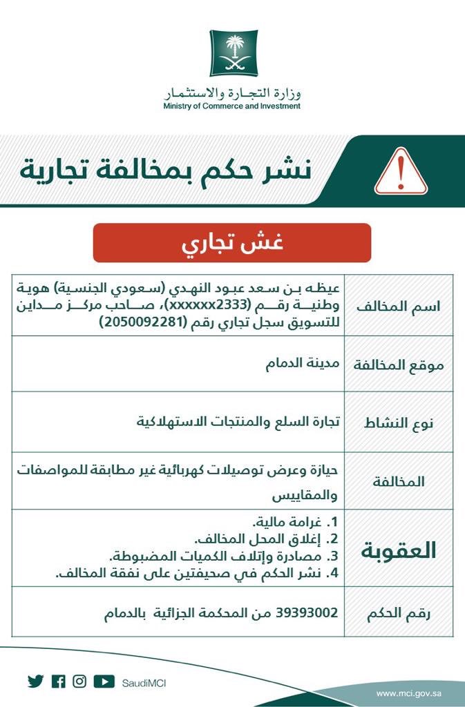 شهرت وزارة التجارة والاستثمار بصاحب مركز تجاري يختص في تجارة السلع والمنتجات الاستهلاكية بمدينة الدمام وذلك بعد صدور حكم قضائي بإدانته في حيازة وعرض توصيلات كهربائية غير مطابق للمواصفات والمقاييس، وهو ما يعد مخالفة لنظام مكافحة الغش التجاري بالنظر لما تشكله تلك المواد من خطورة على سلامة مستخدميها.