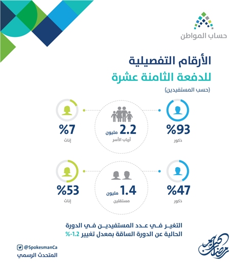 وذكر المتحدث الرسمي لبرنامج حساب المواطن سلطان القحطاني بأن الإناث المستفيدات كأرباب أسر شكلن 7% فيما بلغت نسبة الذكور 93%، وبأن المستقلات الإناث شكلن 53% فيما بلغت نسبة الذكور المستقلين 47%، وبأن 83% من إجمالي المستقلين والبالغ عددهم 1.4 مليون قد تحصلوا على الاستحقاق الكامل، بينما تحصل 17% على الاستحقاق الجزئي والأدنى، وأشار القحطاني بأن معدل التغير في أعداد المستفيدين للدفعة الثامنة عشرة قد بلغ 1.2- %، ليبلغ إجمالي أعداد المستحقين من أرباب أسر ومستقلين 3.72 مليون مستفيد مقارنةً بالدفعة الماضية والتي بلغ عدد مستفيديها 3.77 مليون.