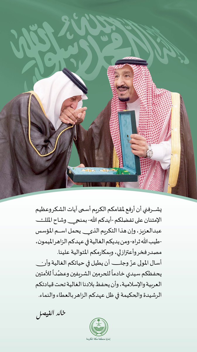 وقال الأمير خالد الفيصل: يشرفني أن أرفع لمقامكم الكريم أسمى آيات الشكر وعظيم الامتنان على تفضلكم بمنحي وشاح الملك عبدالعزيز، وإن هذا التكريم الذي يحمل اسم المؤسس- طيب الله ثراه- ومن يديكم الغالية في عهدكم الزاهر الميمون، مصدر فخر واعتزاز لي، وبمكارمكم المتوالية علينا.