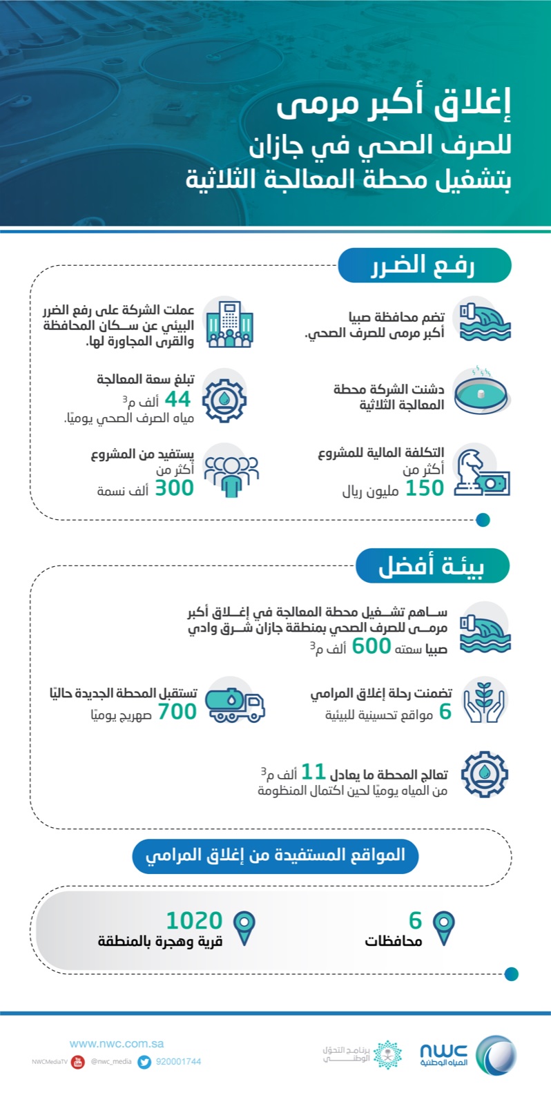 وكانت الشركة ممثلة بالإدارة العامة لخدمات المياه بمنطقة جازان قد نجحت في وقت سابق في إغلاق خمسة مرامي بمنطقة جازان، وإنشاء محطات معالجة مقابلة لها، حيث أنهت هذه الخطوة معاناة سكان 6 محافظات و1020 قرية وهجرة بالمنطقة، وذلك تطبيقًا لاستراتيجية الشركة التي تستهدف إيجاد حلول بيئية متقدمة لهذه المرامي.