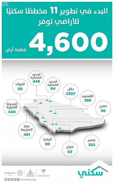 وبيّن برنامج “سكني” في تفاصيل المخططات أنها تشمل مخطط مشروع إسكان الملك عبدالله بسكاكا الممتد على مساحة 146,585م2 ويوفر(50) قطعة، ومخطط مشروع الملك عبدالله ببارق الذي يوفر (50) قطعة موزعة على مساحة فاقت 150 ألف م2، وكذلك مخطط مشروع إسكان الملك عبدالله بشروره ومخطط مشروع إسكان الملك عبدالله بمحافظة العقيق، كما تشمل سبع مخططات أخرى موزعة بين عدد من المناطق والمحافظات، هي مخطط مهد الذهب الممتد على مساحة 500 ألف م2 ويوفر (430) قطعة بمحافظة المهد التابعة لمنطقة المدينة المنورة، ومخطط العرضيات الجنوبية بـ(461) قطعة، ومخطط المصياد بـ(353) قطعة بمحافظة سراة عبيدة التابعة لمنطقة عسير، ومخطط البكيرية بـ (389) قطعة، ومخطط المدائن بمنطقة حائل الذي يمتد على مساحة تقارب 2 مليون و900 ألف م2 ويوفر نحو 2307 قطع، بالإضافة إلى مخططين بمحافظة العويلقية يوفران نحو (539) قطعة أرض.