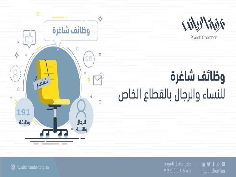 أعلنت غرفة الرياض، عبر موقعها الإلكتروني، عن توفر عدد (191) وظيفة شاغرة للرجال وللنساء، من حملة شهادات الكفاءة المتوسطة والثانوية العامة والدبلوم والبكالوريوس في عدد من التخصصات، وذلك للعمل لدى 5 شركات بالقطاع الأهلي في مدينة الرياض، وهي كالتالي: