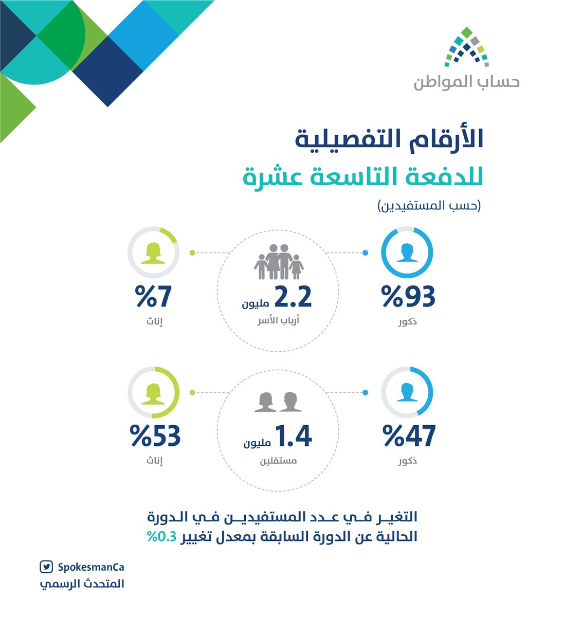 وذكر المتحدث الرسمي لبرنامج حساب المواطن سلطان القحطاني بأن الإناث المستفيدات كأرباب أسر شكلن 7% فيما بلغت نسبة الذكور 93%، وبأن المستقلات الإناث شكلن 53% فيما بلغت نسبة الذكور المستقلين 47%، وبأن 83% من إجمالي المستقلين والبالغ عددهم 1.4 مليون قد تحصلوا على الاستحقاق الكامل، بينما تحصل 17% على الاستحقاق الجزئي والأدنى، وأشار القحطاني بأن معدل التغير في أعداد المستفيدين للدفعة الثامنة عشرة قد بلغ 0.3%، ليبلغ إجمالي أعداد المستحقين من أرباب أسر ومستقلين 3.73 مليون مستفيد مقارنةً بالدفعة الماضية والتي بلغ عدد مستفيديها 3.72 مليون.