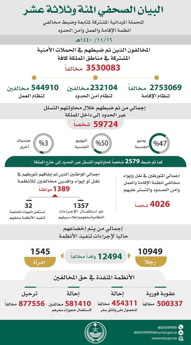 أسفرت الحملات الميدانية المشتركة التي انطلقت يوم الأربعاء الموافق 16 / 2 / 1439هـ وحتى نهاية يوم الخميس 15 / 11 / 1440هـ لتعقب وضبط مخالفي أنظمة الإقامة والعمل وأمن الحدود التي تمت في مناطق المملكة كافة عن النتائج التالية: –