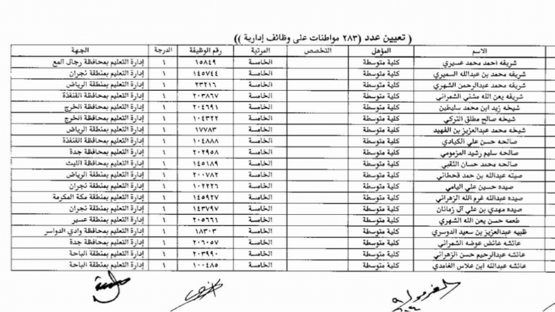أصدر المشرف العام على وكالة وزارة التعليم للموارد البشرية بناءً على الصلاحيات الممنوحة له قرارًا بتعيين ۲۸۳ خريجة دبلوم الكلية المتوسطة على المرتبة الخامسة بعد إتمام عملية المطابقة.
