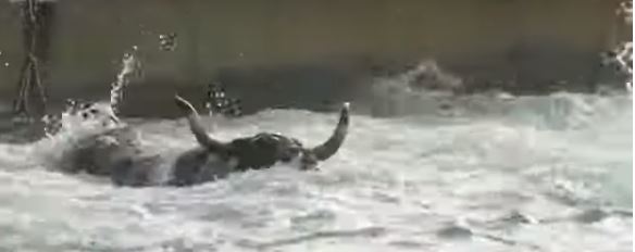وأظهر مقطع فيديو مصارعة الثيران في البحر، حيث يطارد الثور الهائج عددًا من الأشخاص الذين يقفزون في الماء فيلاحقهم هو كذلك.