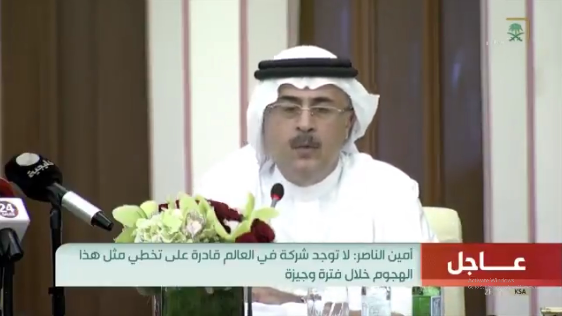 أعلن الرئيس التنفيذي لشركة أرامكو، أمين الناصر، أنه تم تعويض النقص الحاصل بعد الهجوم الإرهابي من المخزون، وأرامكو لديها طاقة فائضة.