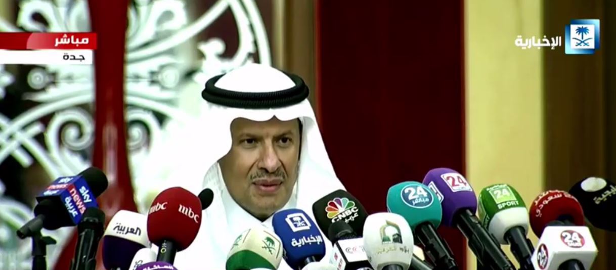 وطالب الأمير عبدالعزيز بن سلمان، خلال مؤتمر صحفي له، مساء اليوم الثلاثاء في جدة، المجتمع الدولي بحماية مصالحه الاقتصادية واتخاذ موقف حازم تجاه الاعتداءات المتكررة، سواء التي تستهدف المنشآت النفطية أو الملاحة البحرية.
