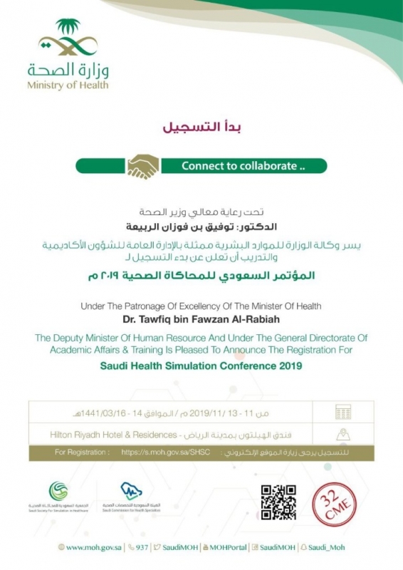 فتحت وزارة الصحة بالتعاون مع الجمعية السعودية للمحاكاة الصحية، باب التسجيل في المؤتمر السعودي للمحاكاة الصحية لعام 2019.