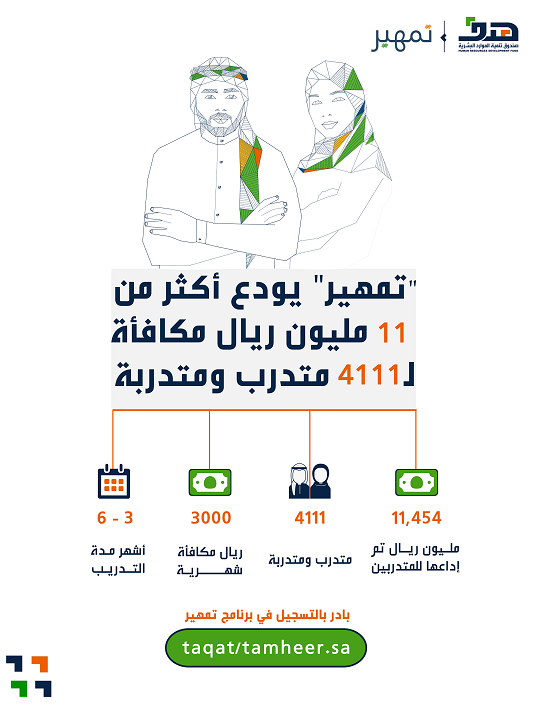 أودع صندوق تنمية الموارد البشرية (هدف)، 11.454 مليون ريال مكافأة لـ 4111 متدرباً ومتدربةً في برنامج التدريب على رأس العمل (تمهير)، وذلك عن شهر نوفمبر الماضي.