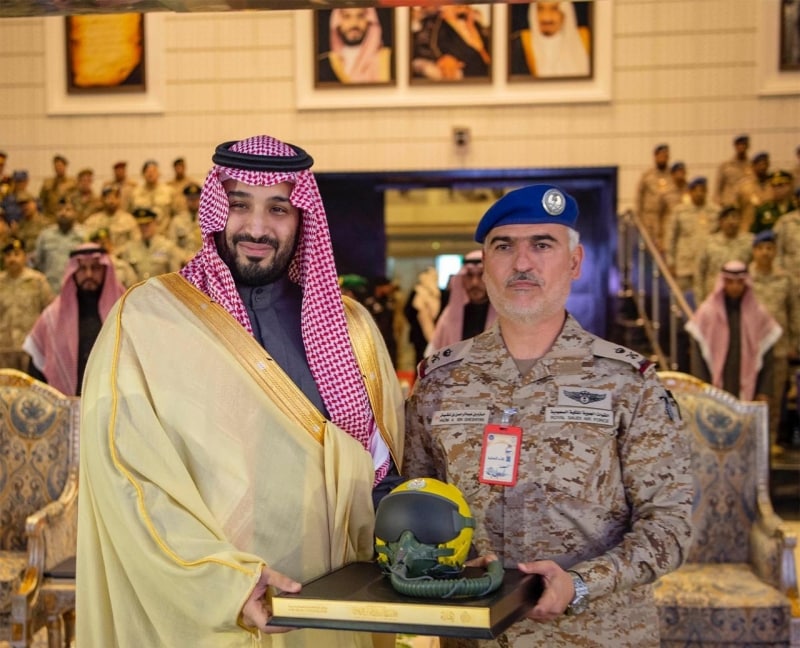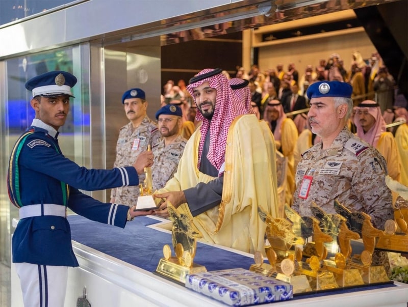 ولدى وصول ولي العهد، يرافقه صاحب السمو الملكي الأمير تركي بن محمد بن فهد بن عبدالعزيز وزير الدولة عضو مجلس الوزراء، وصاحب السمو الملكي الأمير عبدالعزيز بن سعود بن نايف بن عبدالعزيز وزير الداخلية، وصاحب السمو الملكي الأمير عبدالله بن بندر بن عبدالعزيز وزير الحرس الوطني، وصاحب السمو الملكي الأمير خالد بن سلمان بن عبدالعزيز نائب وزير الدفاع، كان في استقبال سمو ولي العهد، معالي رئيس هيئة الأركان العامة الفريق أول ركن فياض الرويلي، وصاحب السمو الملكي الفريق طيار ركن تركي بن بندر بن عبدالعزيز قائد القوات الجوية، وقائد كلية الملك فيصل الجوية اللواء الطيار ركن حازم بن غشيان.