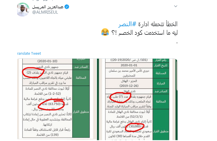 ونشر المريسل عبر حسابه في تويتر نص العقوبة على ناديي الهلال والنصر عند إلقاء عبوات المياه حيث قال: “الخطأ تتحمله إدارة النصر، ليه ما استخدمت كود الخصم؟!”.