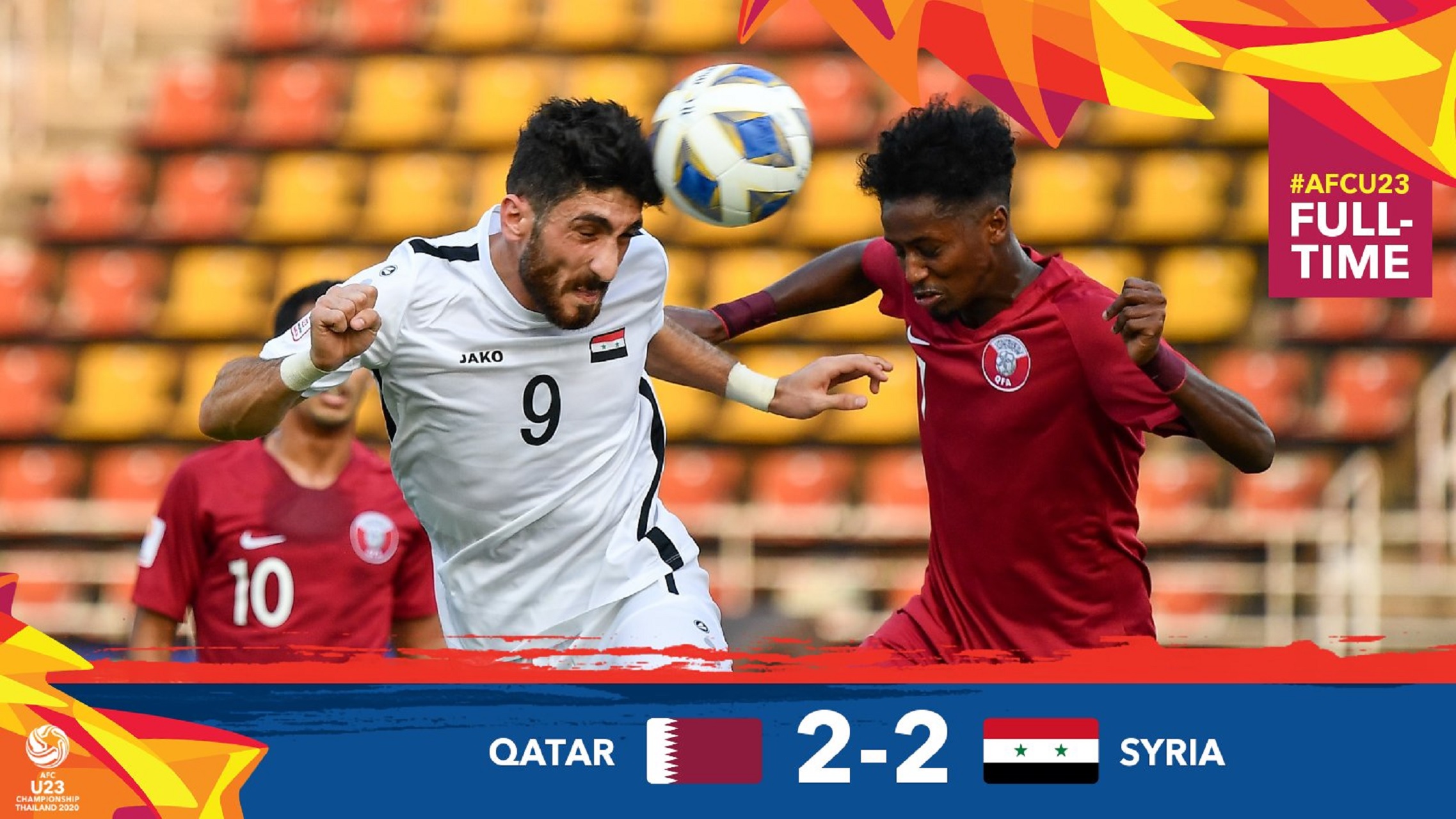 انتهت مباراة سوريا وقطر التي أُقيمت على ملعب توماسات في بانكوك، ضمن منافسات بطولة كأس آسيا تحت 23 عامًا بالتعادل الإيجابي بهدفين لكل منهما.