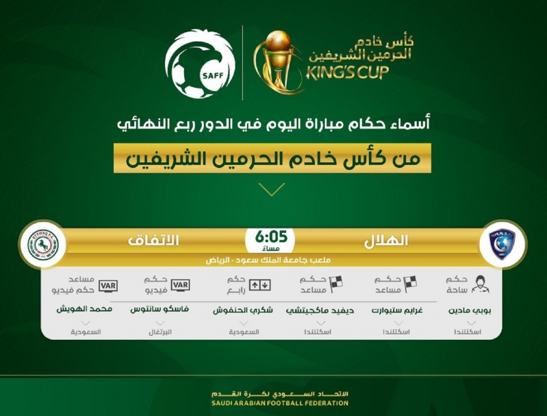 أعلنت لجنة الحكام في الاتحاد السعودي لكرة القدم عن حكم مباراة الهلال والاتفاق اليوم في بطولة كأس خادم الحرمين الشريفين.