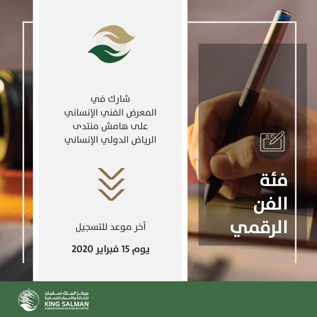 دعا مركز الملك سلمان للإغاثة محبي الفن والتقنية للاشتراك في المعرض الفني الإنساني التابع لمنتدى الرياض الدولي الإنساني، ضمن فئة الفن الرقمي.