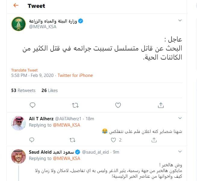 وقالت وزارة البيئة في التغريدة الغريبة : عاجل : البحث عن قاتل متسلسل تسببت جرائمه في قتل الكثير من الكائنات الحية.