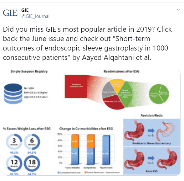 أكدت مجلة الجمعية الأمريكية لمناظير الجهاز الهضمي المرموقة، GIE، أن الدراسة السعودية المنشورة بالمجلة تعد أكثر المقالات العلمية شهرة من بين كل المقالات العلمية التي نشرتها المجلة لعام 2019، مشيرة إلى أن الدراسة هي الأكثر خبرة عن عمليات كرمشة المعدة، أو ما يعرف بتكميم المعدة دون جراحة، والتي أجراها البروفيسور عائض القحطاني.