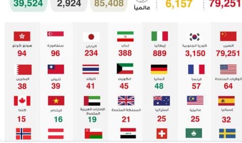 يذكر أن العدد الإجمالي للحالات حول العالم بلغ 85408 أشخاص معظمهم في الصين، تعافى منهم 39524، بينما توفي 2924.