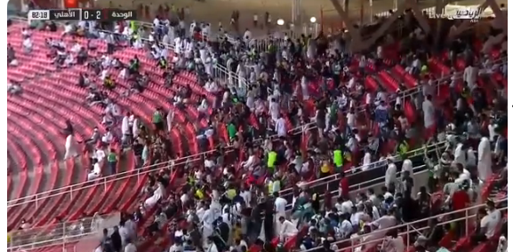 التقطت عدسات الكاميرا جماهير النادي الأهلي، وهي تُغادر ملعب المباراة، بعد إحراز نادي الوحدة لهدفه الثاني في اللقاء الذي جمع بين الفريقين، اليوم الجمعة، بالجولة الثامنة عشرة لبطولة دوري الأمير محمد بن سلمان للمحترفين.