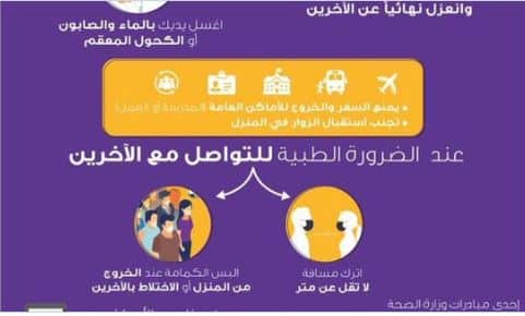 وقال الدفاع المدني إنه يجب استخدام المناديل عند الكحة أو العطاس والتخلص منها في سلة مغلقة أو تغطية الفم بالمرفق عند العطاس، كما يجب البقاء في المنزل مدة الحجر المنزلي كاملة والتي تقدر بـ14 يومًا وهي الفترة التي تظهر في أعراض كورونا الأولية على المصابين.