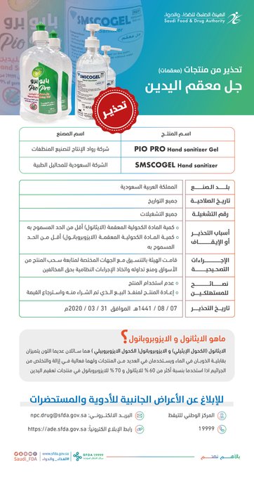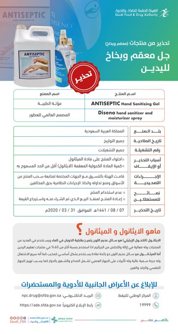 حذرت هيئة الغذاء والدواء من 5 مُعقمات للأيدي؛ بسبب احتوائها على مادة الميثانول، واحتواء بعضها على نسبة أقل من مادة الإيثانول.
