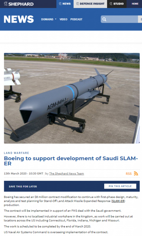 حصلت بوينغ على عقد قيمته 8 ملايين دولار لتصميم وتطوير واختبار المرحلة الأولى من إنتاج صاروخ SLAM-ER، للمملكة.