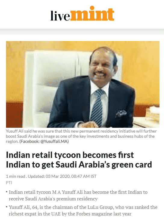أصبح رجل الأعمال الهندي، يوسف علي، 64 عامًا، أول هندي يحصل على الإقامة المميزة في المملكة والمعروفة بالبطاقة الخضراء، وهي تمنح المغتربين الحق في العيش والعمل والتملك التجاري في المملكة دون الحاجة إلى كفيل، وهي تأتي كجزء من خطة رؤية 2030 لتعزيز الاقتصاد.