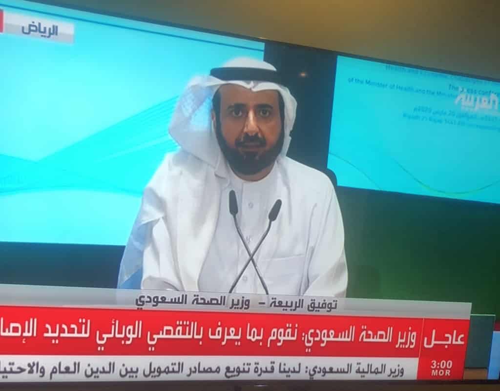 جاء ذلك خلال المؤتمر الصحفي المشترك لوزير الصحة الدكتور توفيق الربيعة، ووزير المالية وزير الاقتصاد والتخطيط المكلف محمد بن عبدالله الجدعان اليوم بمقر هيئة الإعلام المرئي والمسموع في الرياض حول تحديات أزمة فيروس كورونا الصحية والاقتصادية.