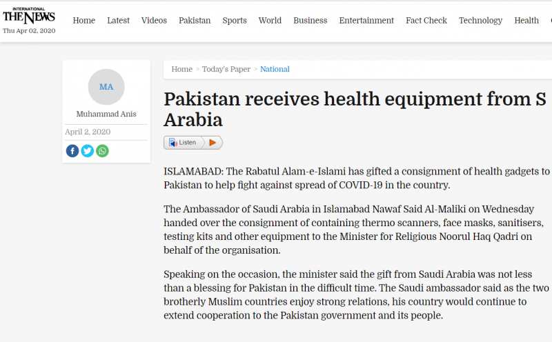 وقالت صحيفة The News الباكستانية، وهي أكبر صحيفة باللغة الإنجليزية في باكستان، إن سفير المملكة في إسلام آباد، نواف سعيد المالكي، سلّم شحنة تضم ماسحات حرارية، وأقنعة وجه طبية، ومعقمات، ومعدات اختبار، ومعدات أخرى لمدير البرنامج الوطني لمكافحة فيروس كورونا ومعالي وزير الشؤون الدينية في باكستان د. نور الحق قادري، نيابة عن المنظمة.