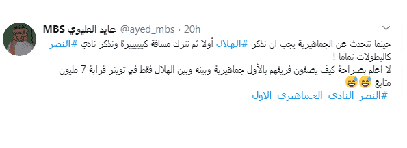أما الناقد الرياضي فلاح القحطاني فقال: “لغة الأرقام والإحصائيات والاستفتاءات (النزيهة) تثبت يومًا بعد آخر أن النصر هو النادي الجماهيري الأول”.